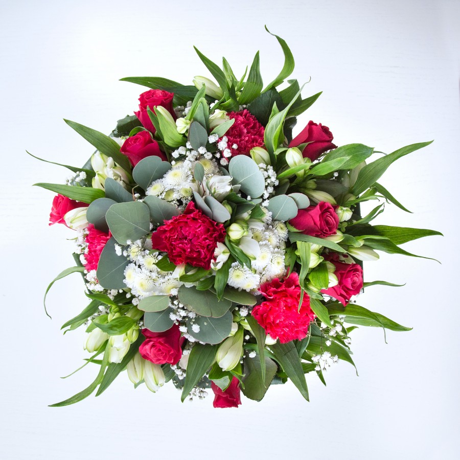 Step into a world of vibrant natural beauty with our radiant floral splendor. This luxurious bouquet is meticulously arranged using sweet white chrysanthemums, delicate gypsophila, bold red roses, and gentle carnations, accented with smooth white alstroemeria and rich aspidistra leaves. Each flower is carefully hand-selected to ensure unparalleled freshness and style.